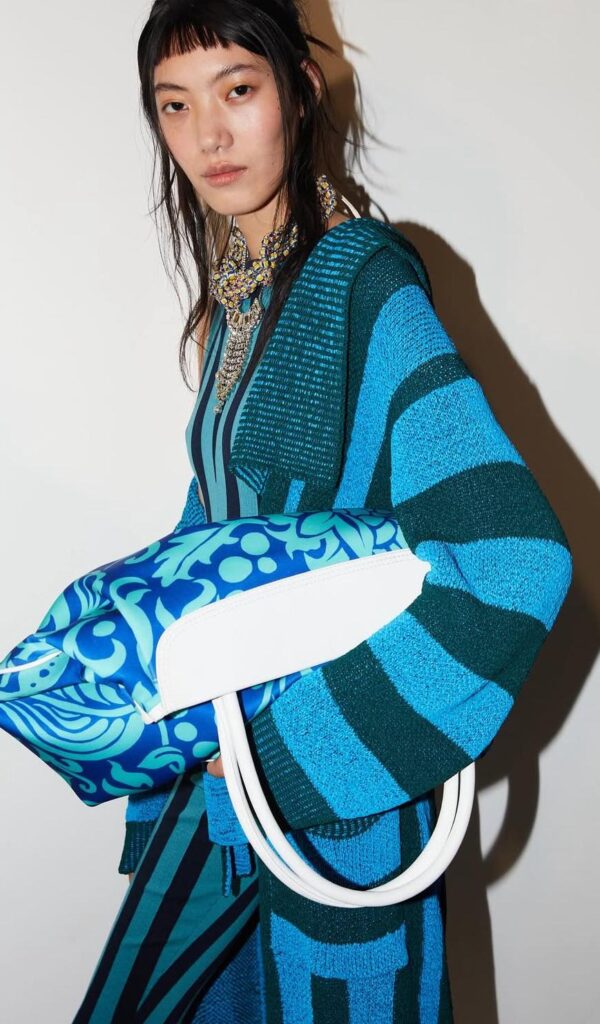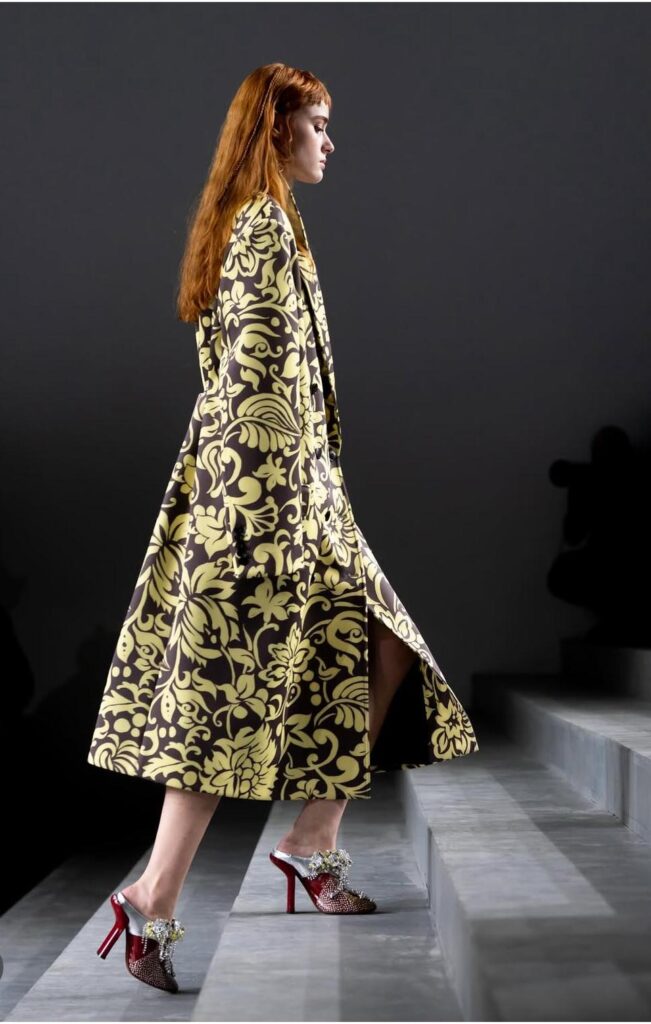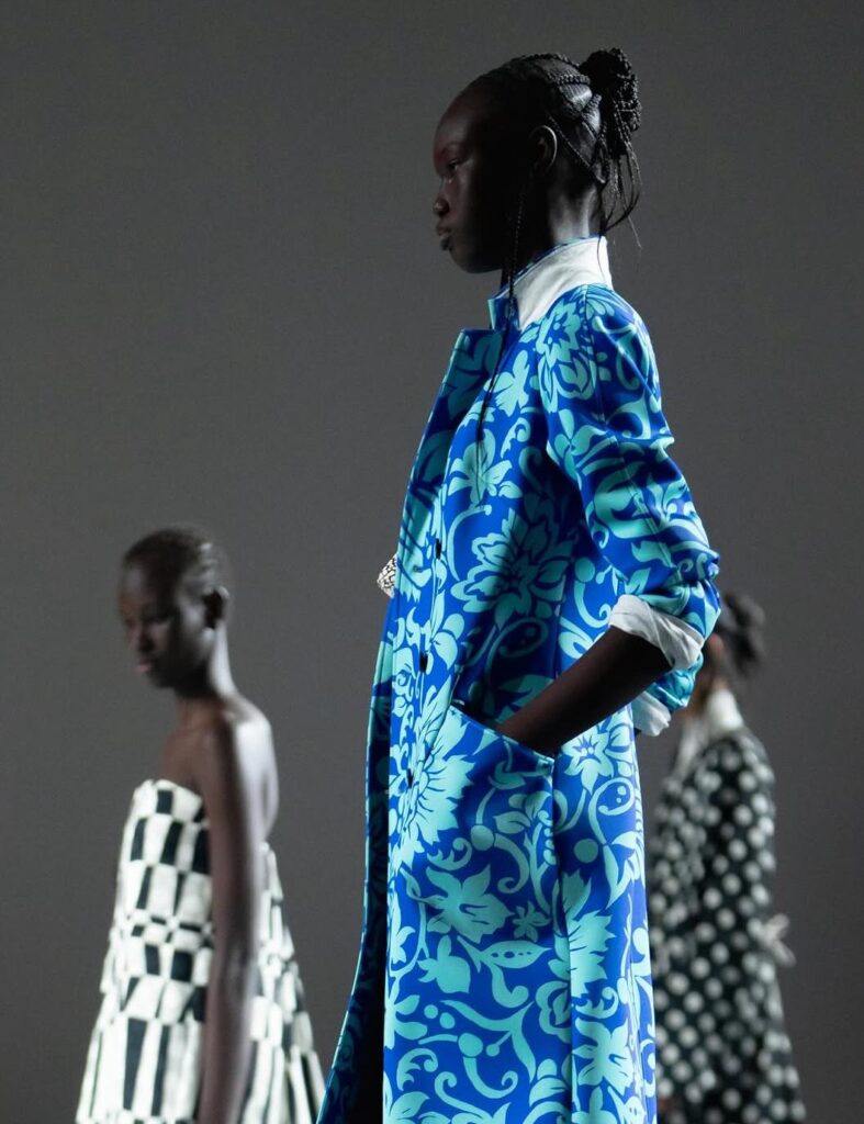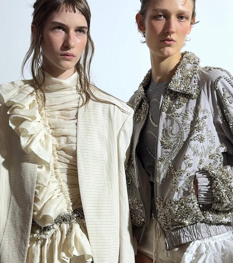 A coleção também destacou o uso de tecidos cintilantes e texturizados, criando um efeito visual dinâmico e contemporâneo. Elementos como babados, mangas bufantes e cinturas dobradas adicionaram um toque lúdico e sofisticado às peças, mantendo a essência da marca.