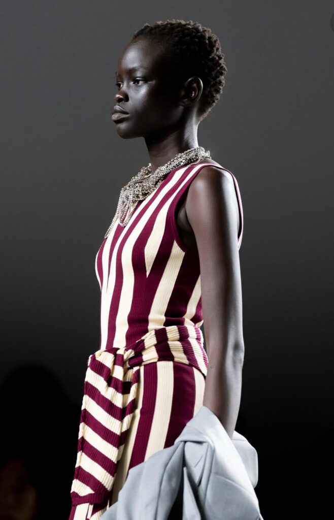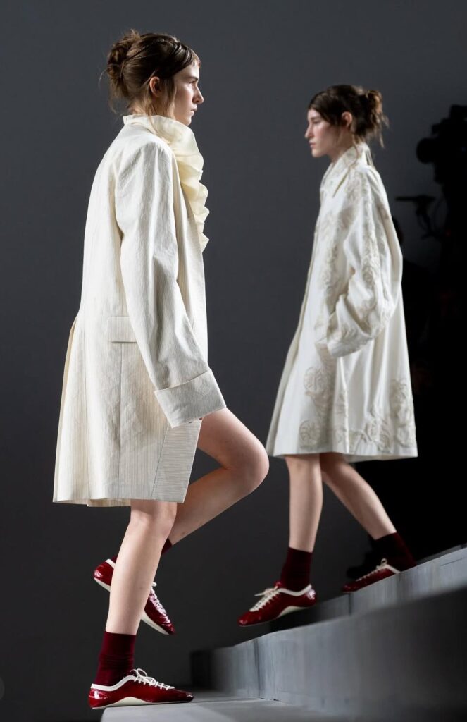 As peças apresentaram uma combinação entre alfaiataria clássica e tecidos técnicos, como putty, preto e tinta, contrastando com amarelos ácidos e pêssegos. As silhuetas eram ao mesmo tempo construídas e líquidas, futuristas e artesanais, refletindo uma estética contemporânea. Detalhes como pregas, babados e cores suaves como limão, musgo, cinza claro e amarelo canário foram explorados, trazendo um frescor à passarela.